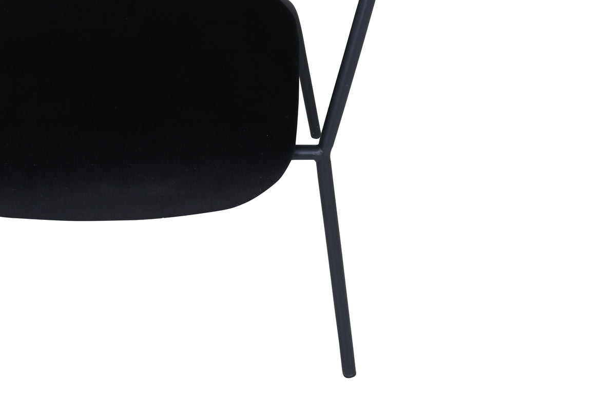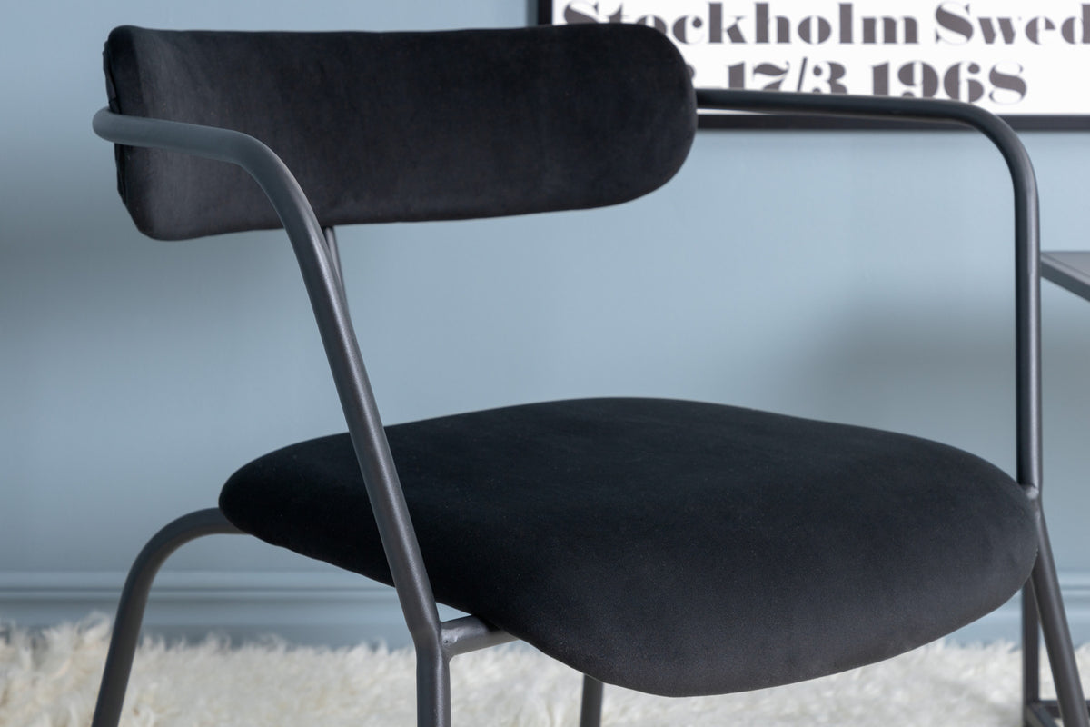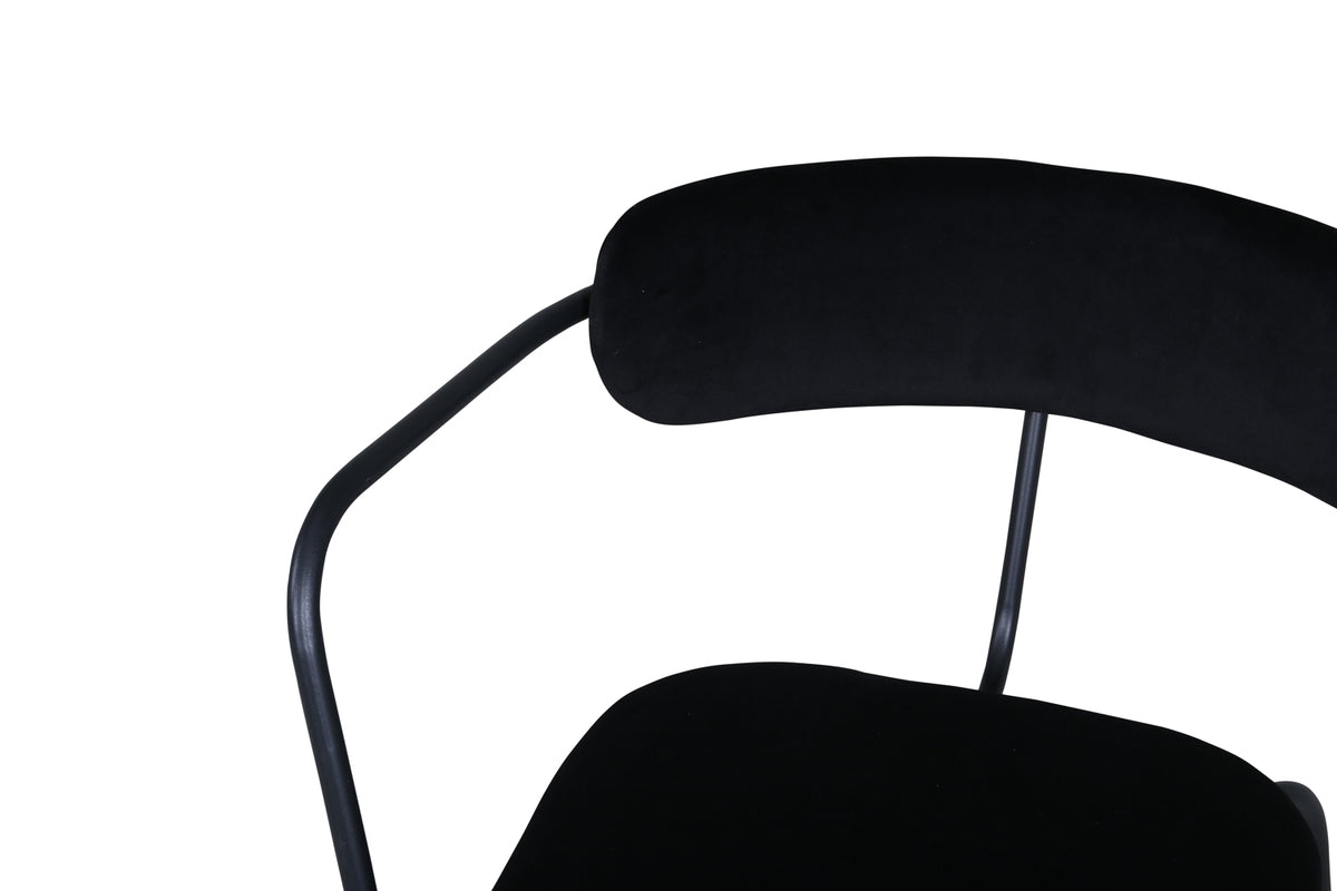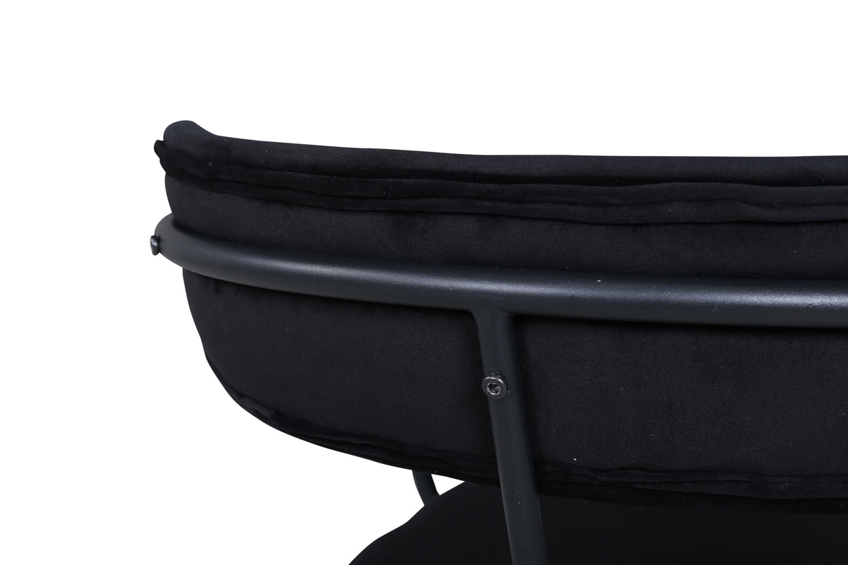 Ryggen är lätt rundad i samma material som sitsen, svart sammetstyg som är stoppad för extra komfort. Inred ditt hem med en fåtölj designad helt efter trenderna!
