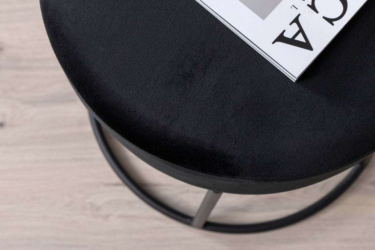 Sittpuffen Petra i genomgående svart kulör och sammetslena tyg skapar ett stilsäkert blickfång i ditt hem! Trots sin nätta storlek gör den ett imponerande intryck och passar lika bra solitär som inredningsdetalj, som tillsammans med din soffgrupp.