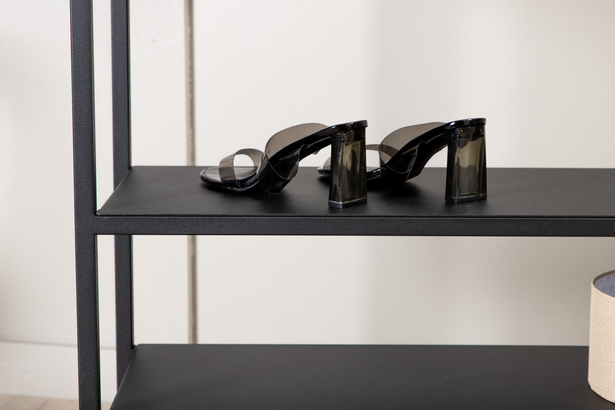 Garderoben är i svart metall och har flera praktiska hyllor i olika storlekar. Något som absolut inte får glömmas att nämnas är såklart den tillhörande spegeln, perfekt när kläderna ska väljas på morgonen.