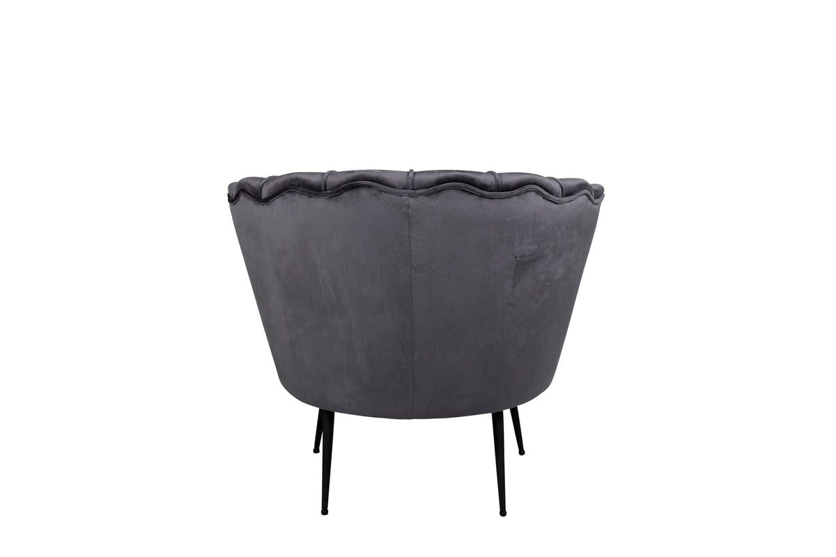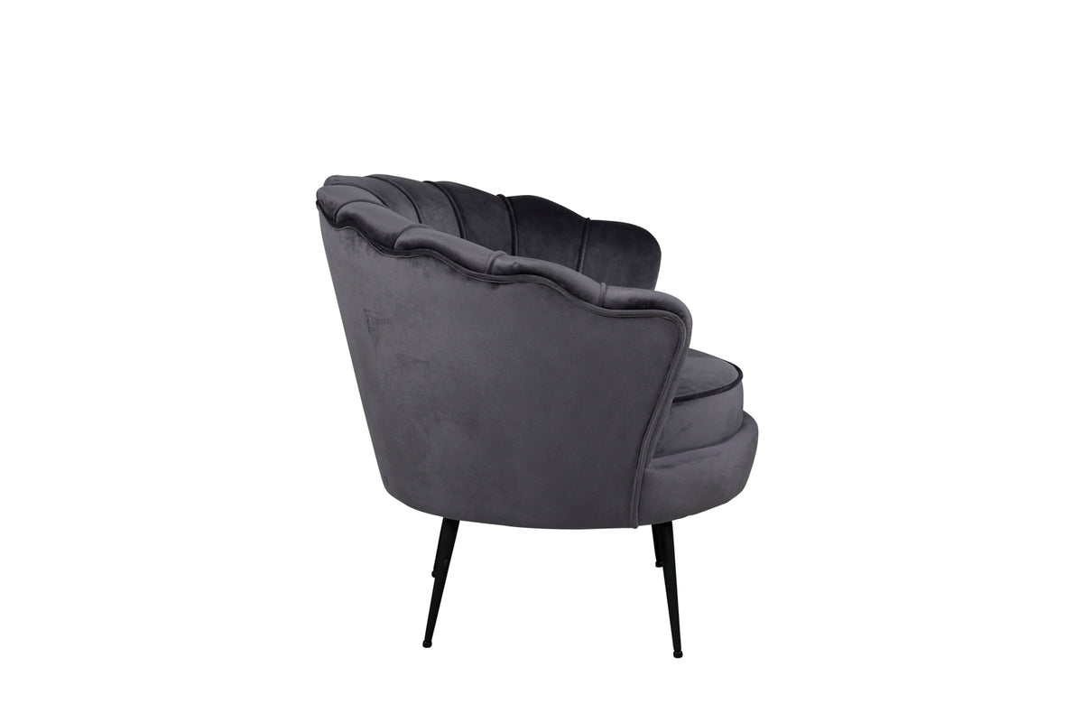 Den har en stilfull design med dekorativ snäckformad rygg med dekorsömmar och en rund sits, genomgående i mörkgrått sammetstyg som skapar ett elegant lyster till rummet. Benen är lätt utsvängda i svart pulverlackerad metall. Placera solitär eller matcha med soffgruppen i samma serie!