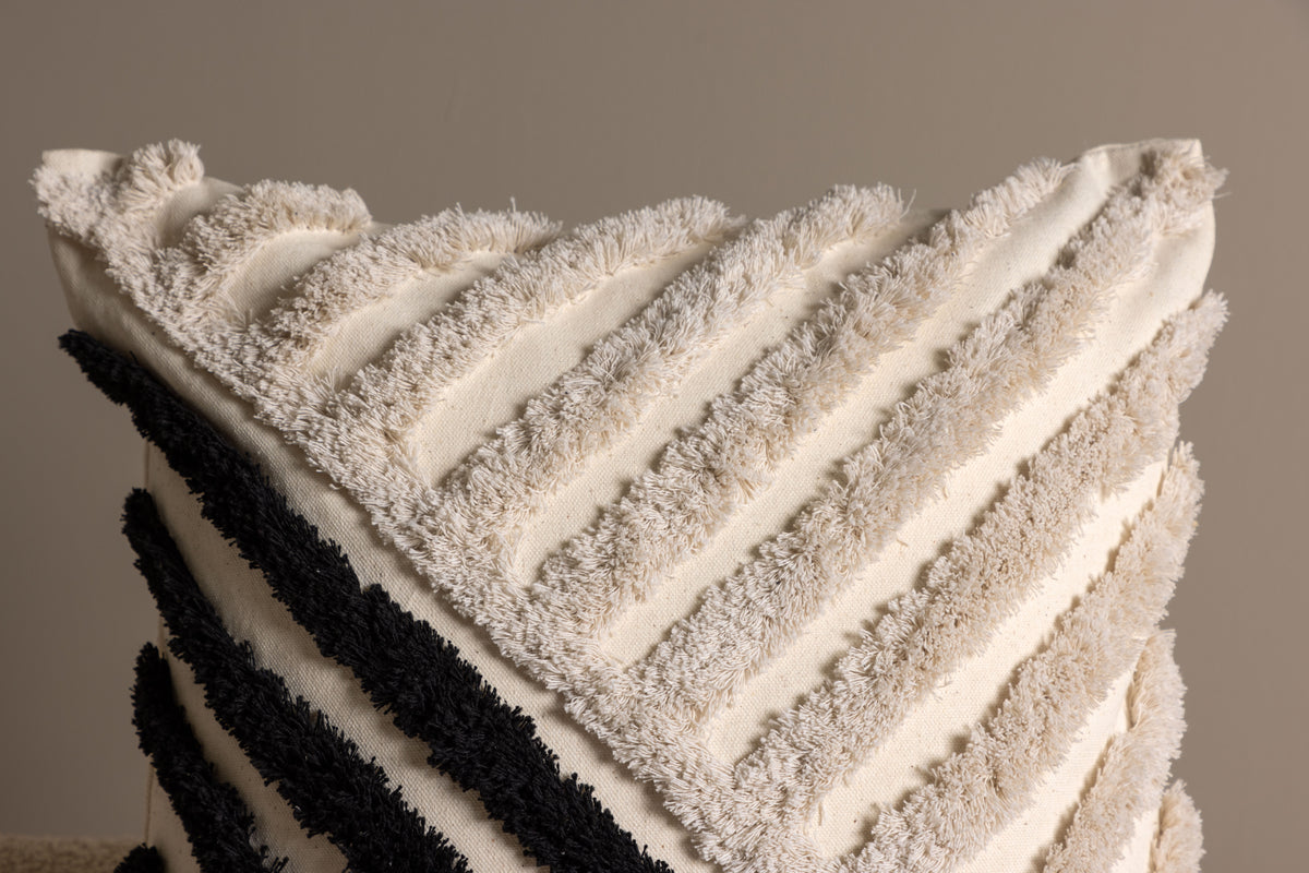 Pryd din soffa eller fåtölj med en snygg kudde från serien Zara! Det här kuddfodralet är både modernt och slitstarkt i poly-bomullsblandning med ett tuftat mönster som ger både liv och struktur till kudden. Kuddfodralet finns i två olika storlekar, här en klassisk kvadratisk utformning. Färgbasen är i gräddig beige kulör och hälften av det abstrakta, linjära mönstret är i svart. Matcha och variera med andra kuddfodral runt omkring och låt det här stå i centrum!