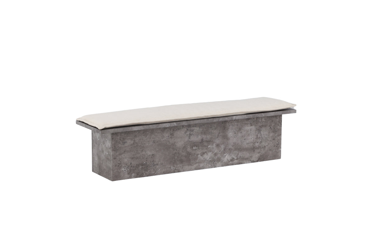 En bänk designad helt i linje med trenderna! Den här bänken från serien Kellogg har en rektangulär sits med beige dyna på och integrerat underrede format likt ett rätblock i industriell design.