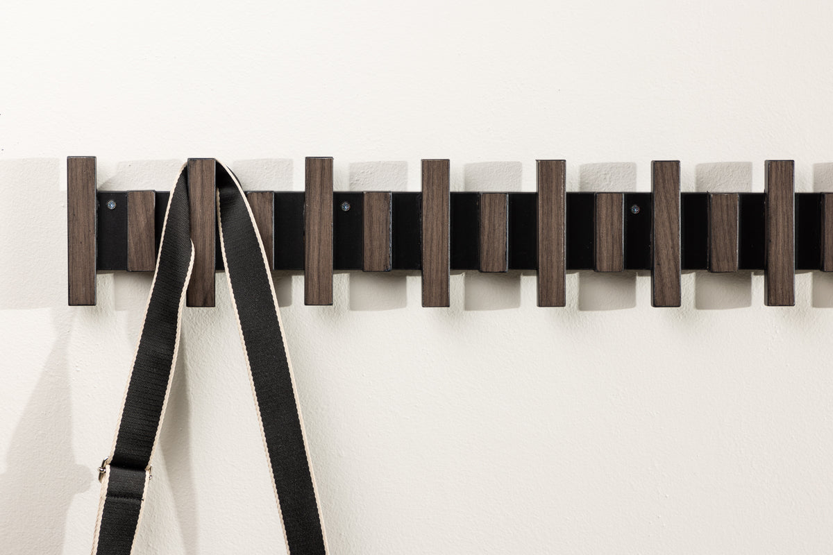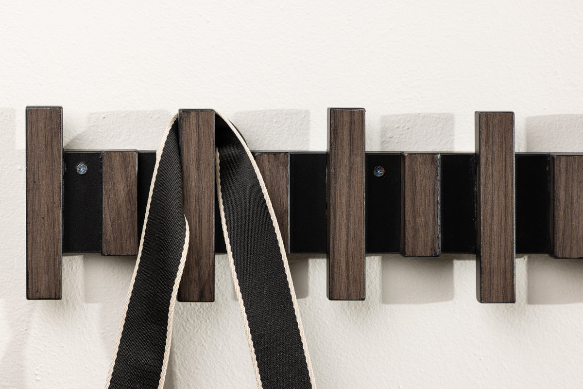 Med Nimes får du en smart och effektiv lösning för att hänga upp allt från jackor till skor och accessoarer. Håll ordning på dina vardagliga föremål utan att kompromissa med stilen. Dessutom har den en tidlös design. Tillverkad i mörkbrun MDF och en svart metallskena skapar den här hängaren en modern känsla som smälter väl in i olika inredningsstilar.