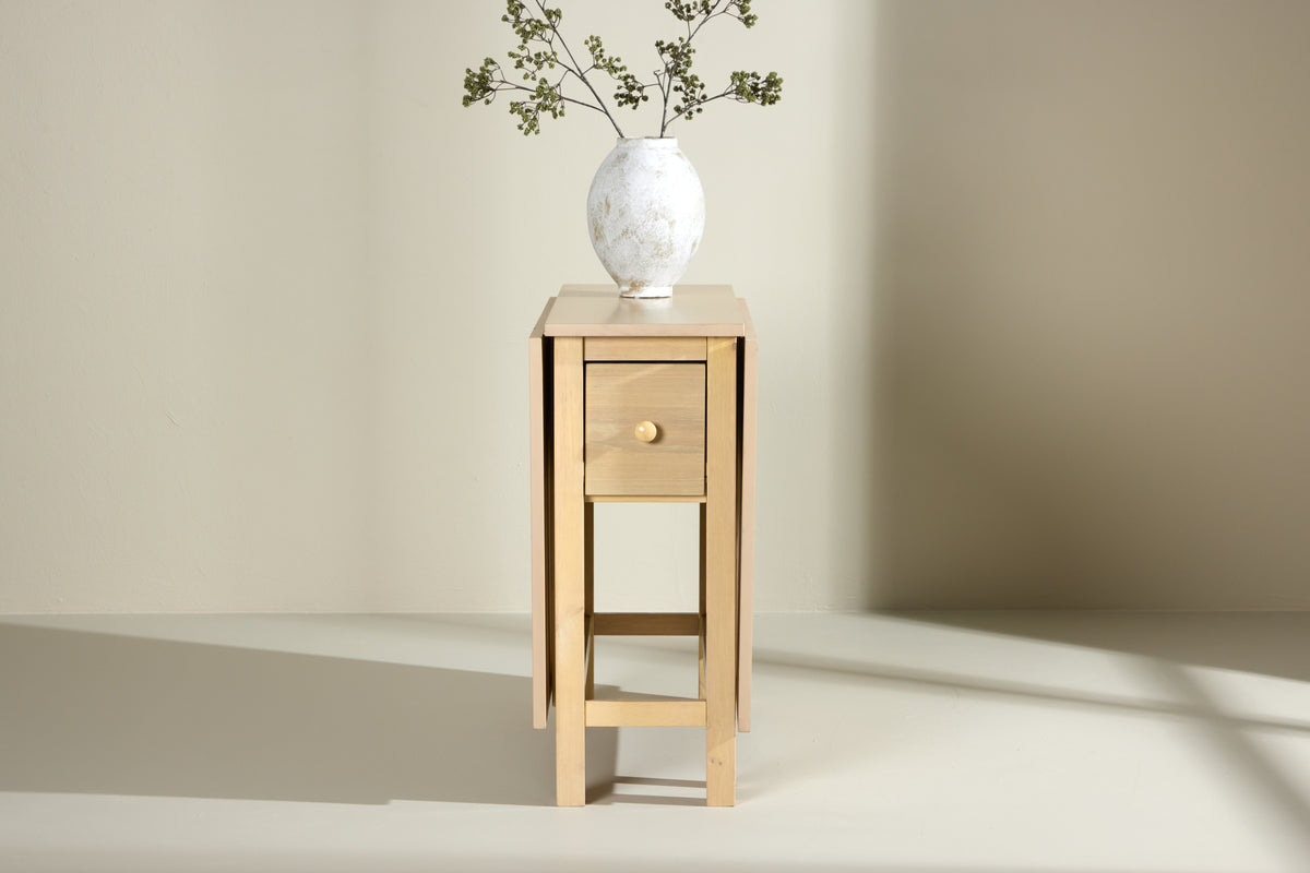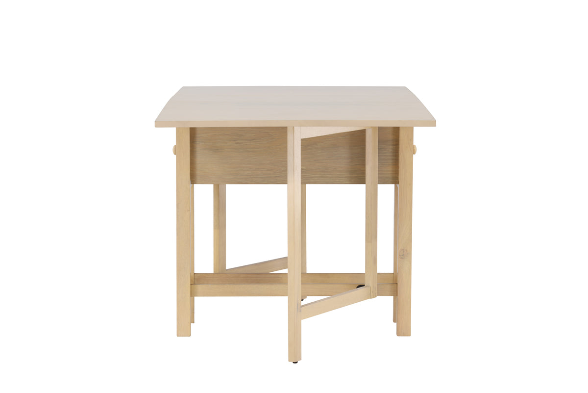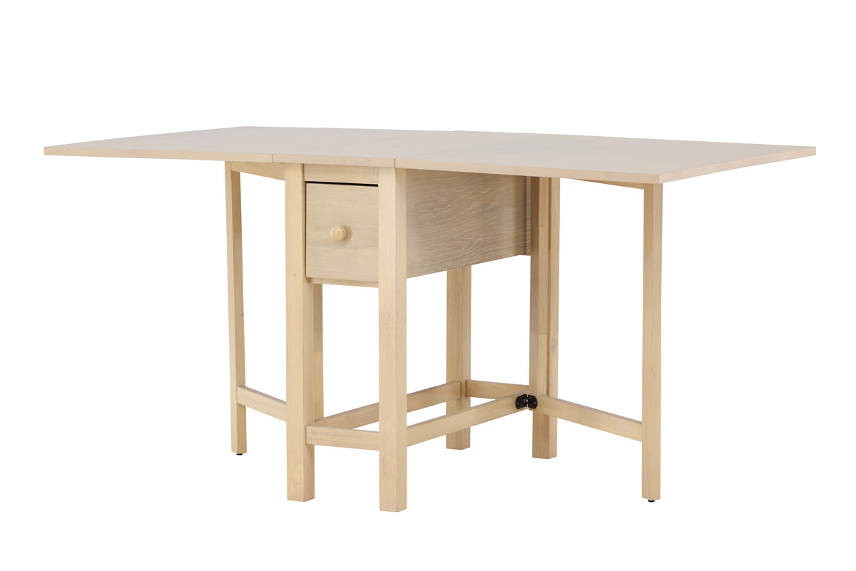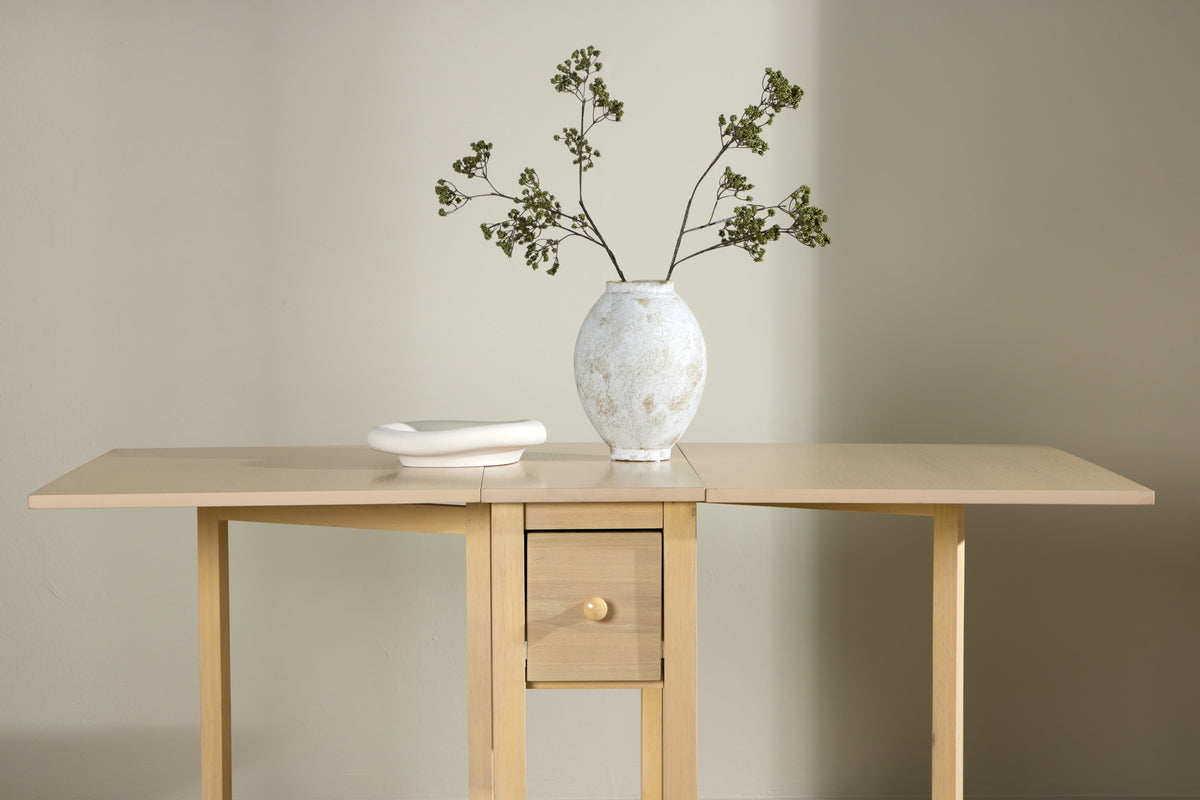 Den vittvättade färgen framhäver träets naturliga struktur och ger bordet en ljus, luftig känsla som skapar en inbjudande atmosfär i ditt hem. Den subtila nyansen gör det enkelt att matcha bordet med olika inredningsstilar och färgpaletter, från modern minimalism till mer traditionella och rustika miljöer. Edward är utformat för att vara både praktiskt och estetiskt tilltalande. När du behöver mer plats för gäster eller extra serveringsutrymme, förlänger du enkelt bordet till 150 cm. Denna flexibilitet gör Edward idealiskt för både vardagliga måltider och större sammankomster, samtidigt som det sparar plats när det inte används.