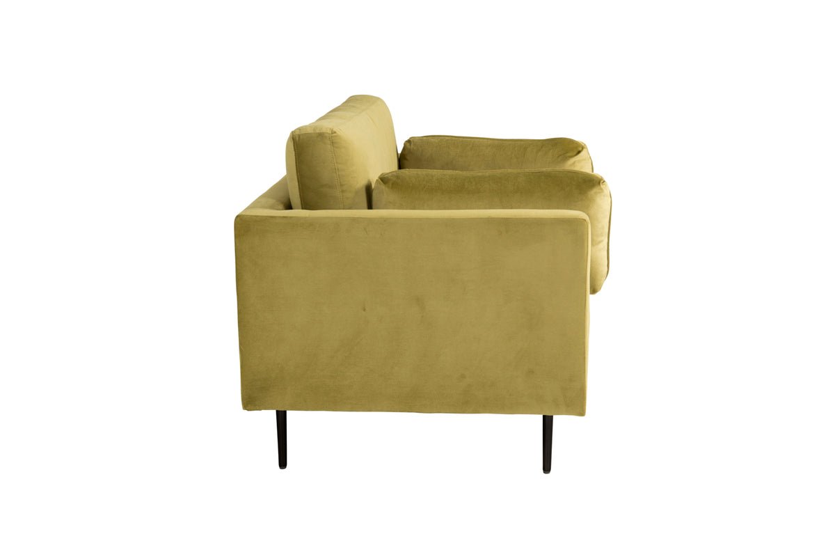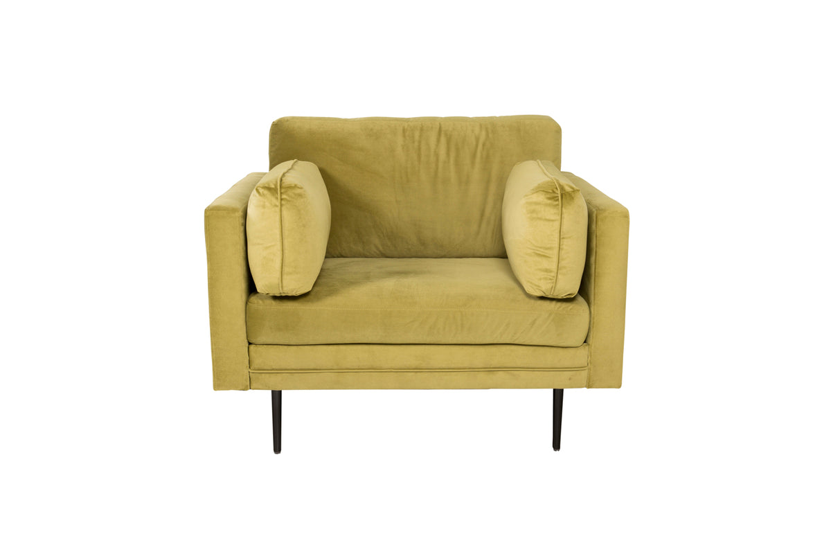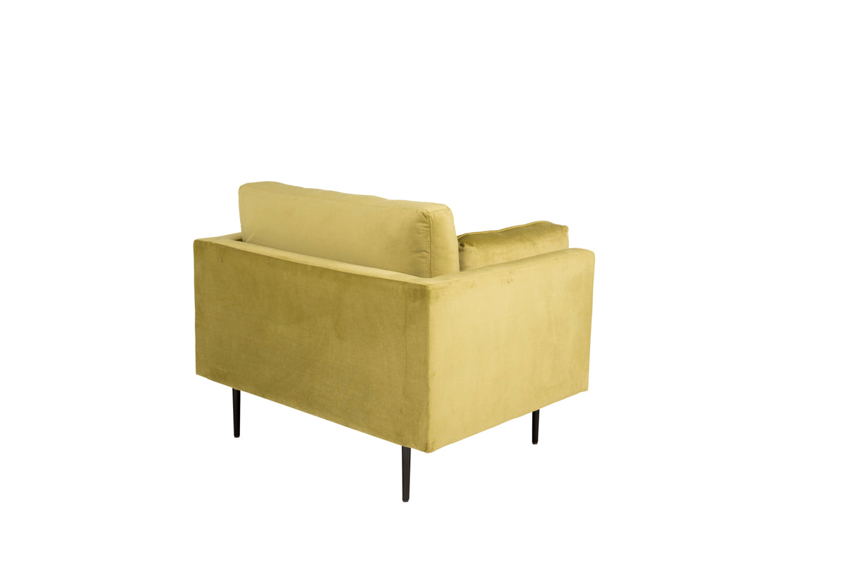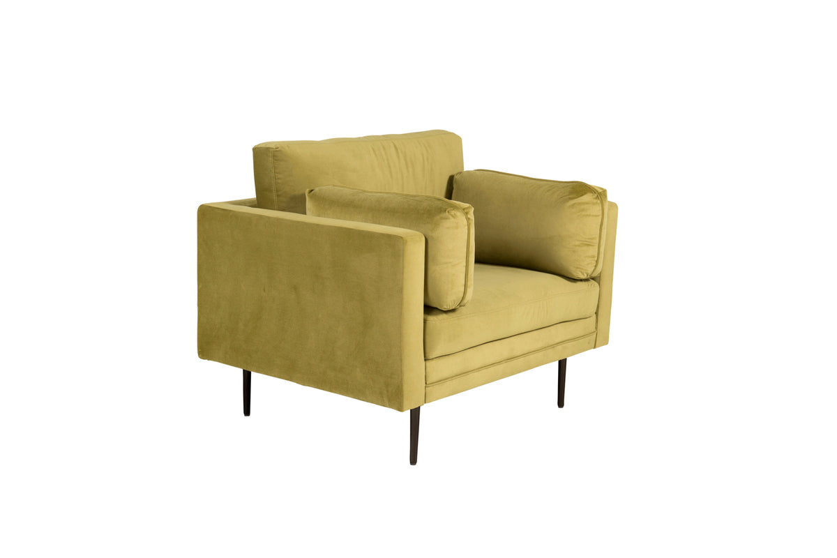 En iögonfallande fåtölj - Sätt tonen och inred ditt hem med en läcker färgklick i vacker grön kulör! Serien Boom har en fantastiskt genomtänkt helhetsdesign med raka men samtidigt mjuka former, smala, höga ben och generöst sittdjup som skapar en luftig och inbjudande känsla. Det eleganta, lena sammetstyget ger vardagsrummet ett härligt lyster.