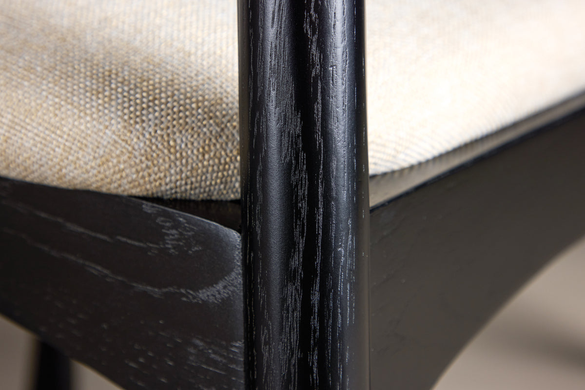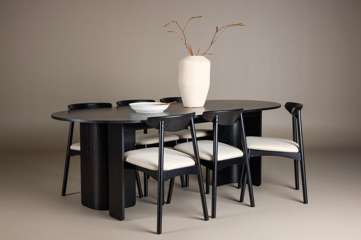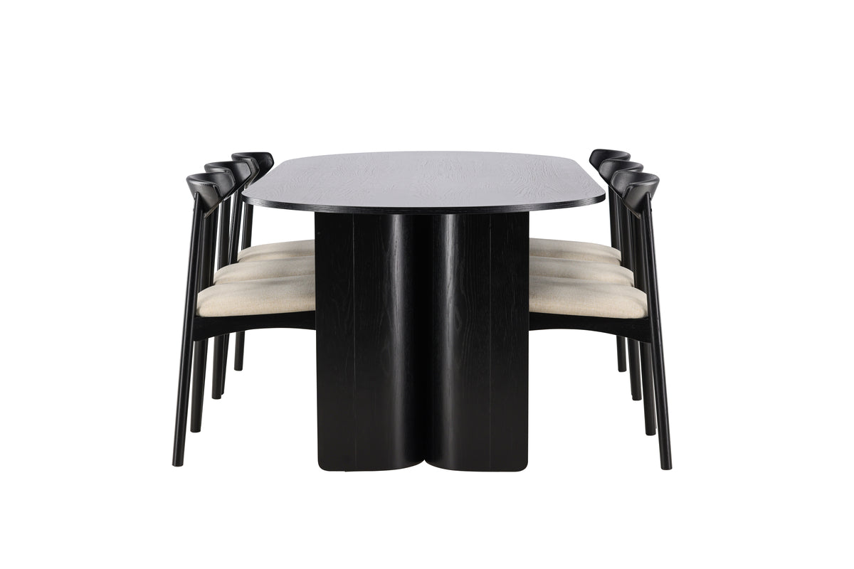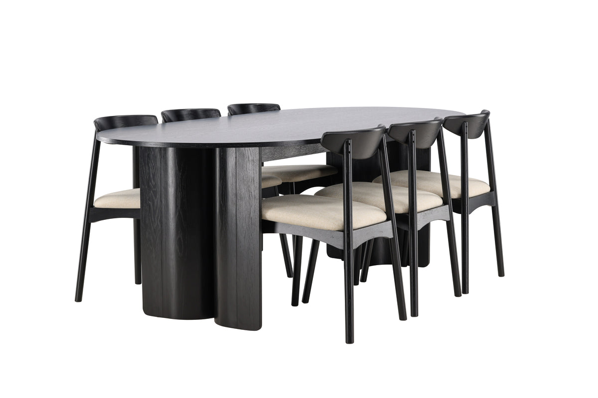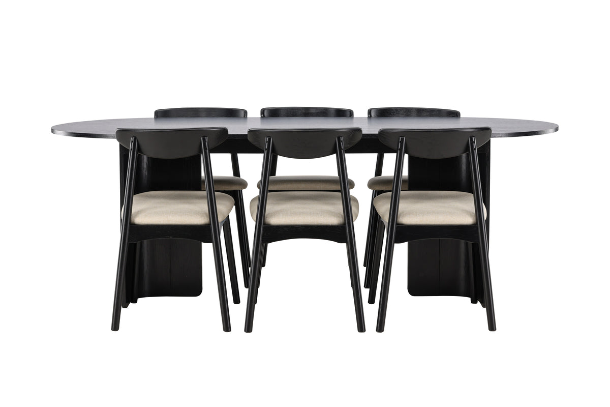 De 6 st medföljande Ven-stolarna har en svart ram som harmonierar med bordet, medan den beige sitsdynan tillför en varm och mjuk kontrast. Tillsammans skapar de en balanserad helhet som passar lika bra till vardagens måltider som till större bjudningar.